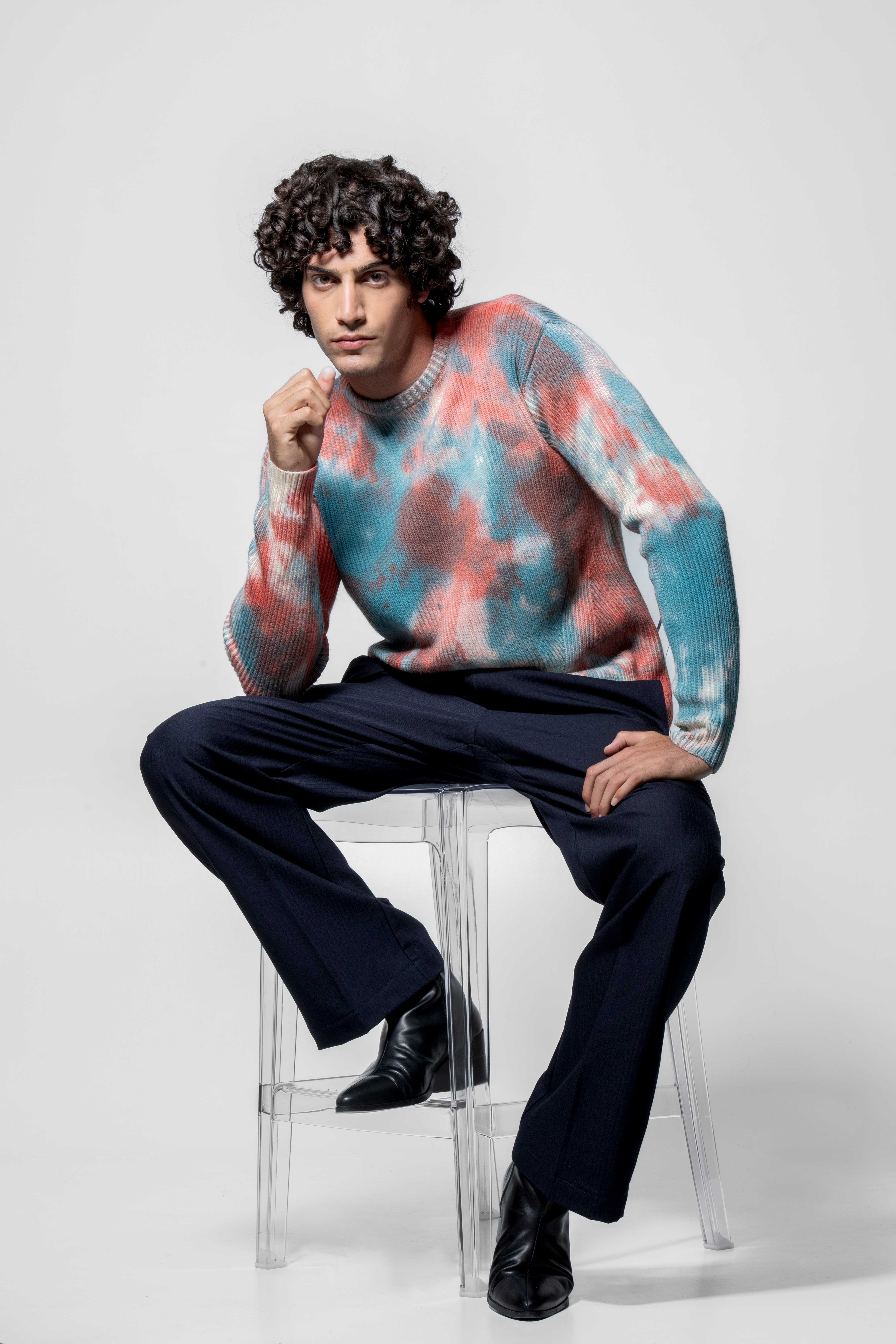 Maglione girocollo a costa inglese con trattamento handmade petrolio