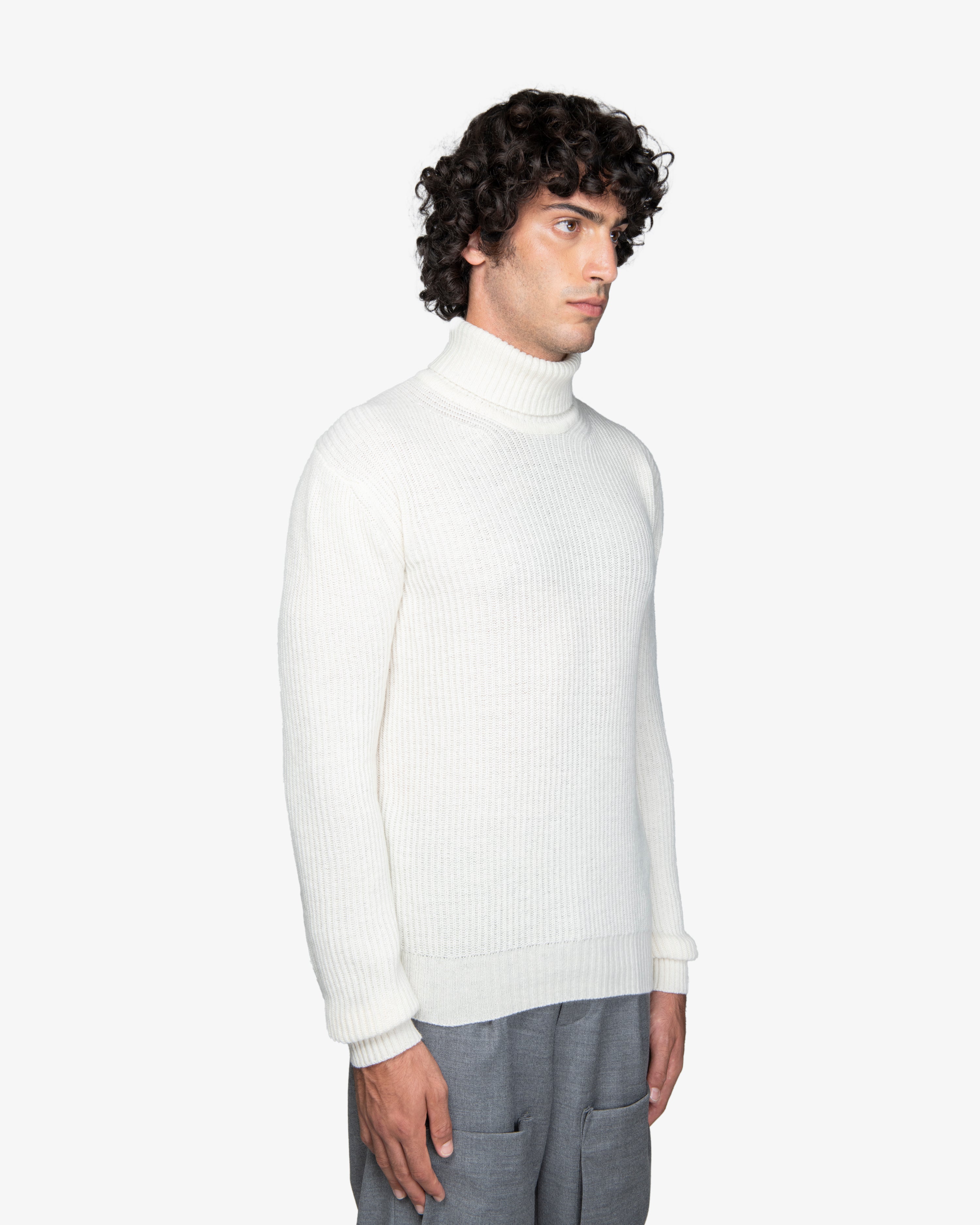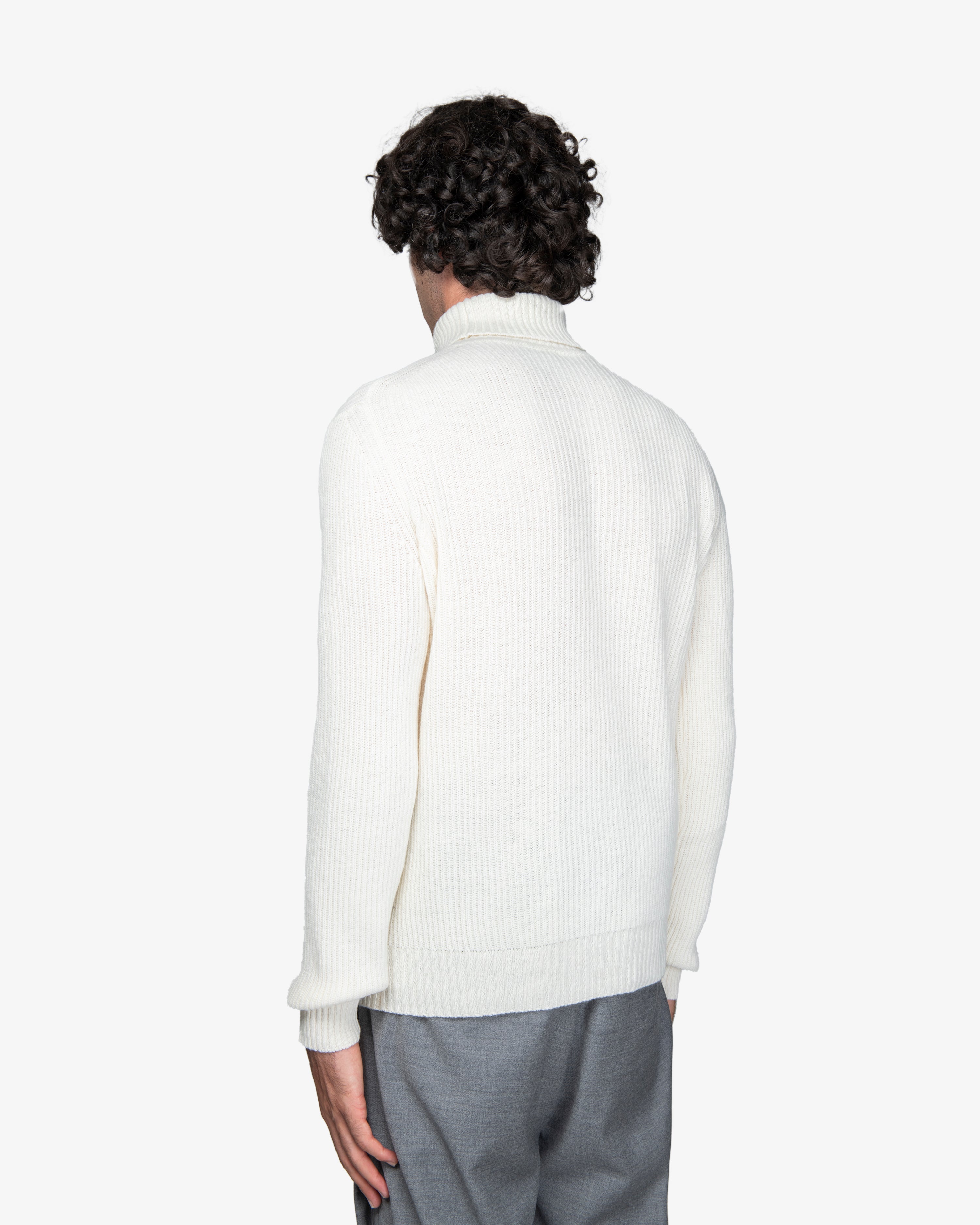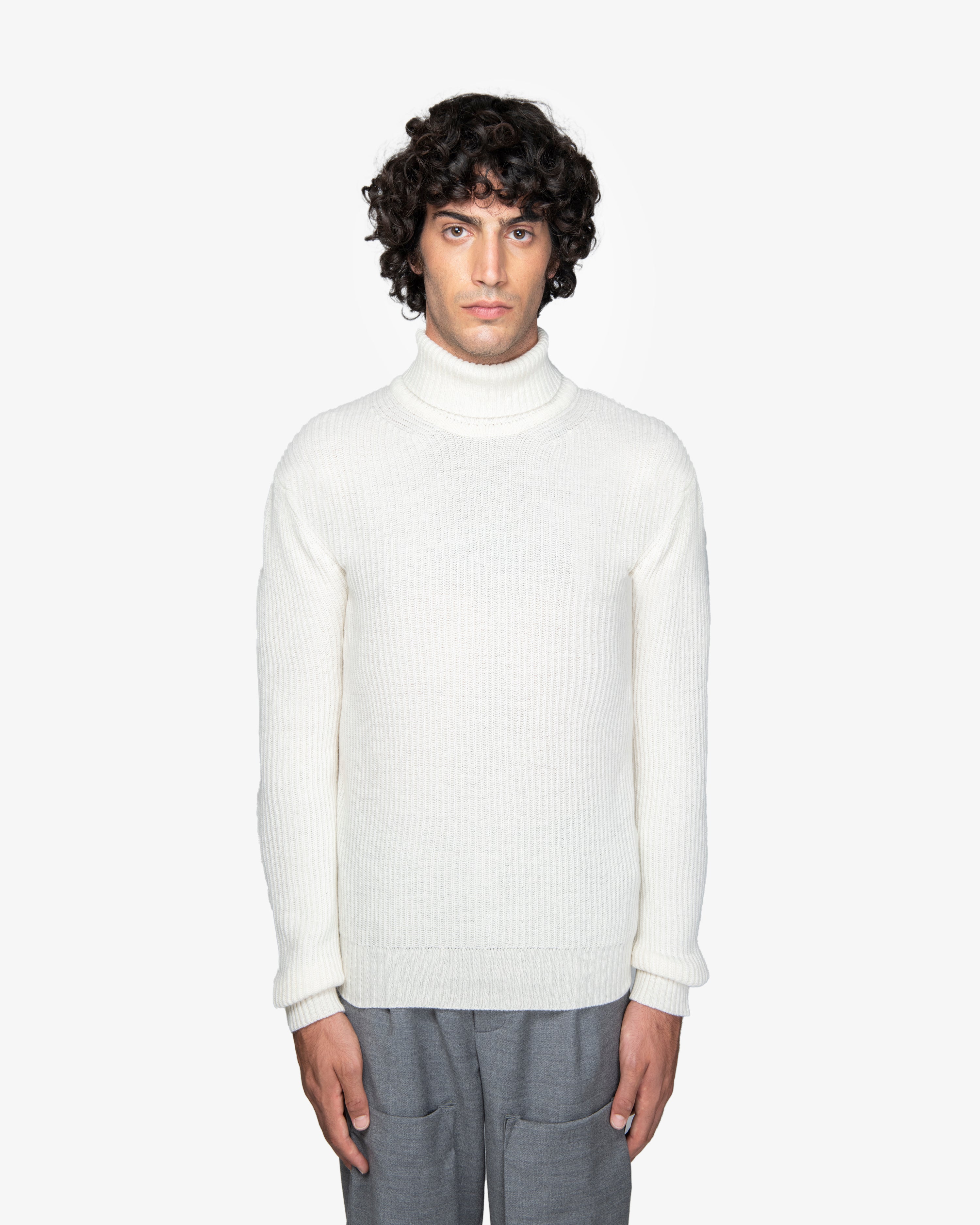 Maglione dolcevita con lavorazione a costa inglese. Finiture a costine.