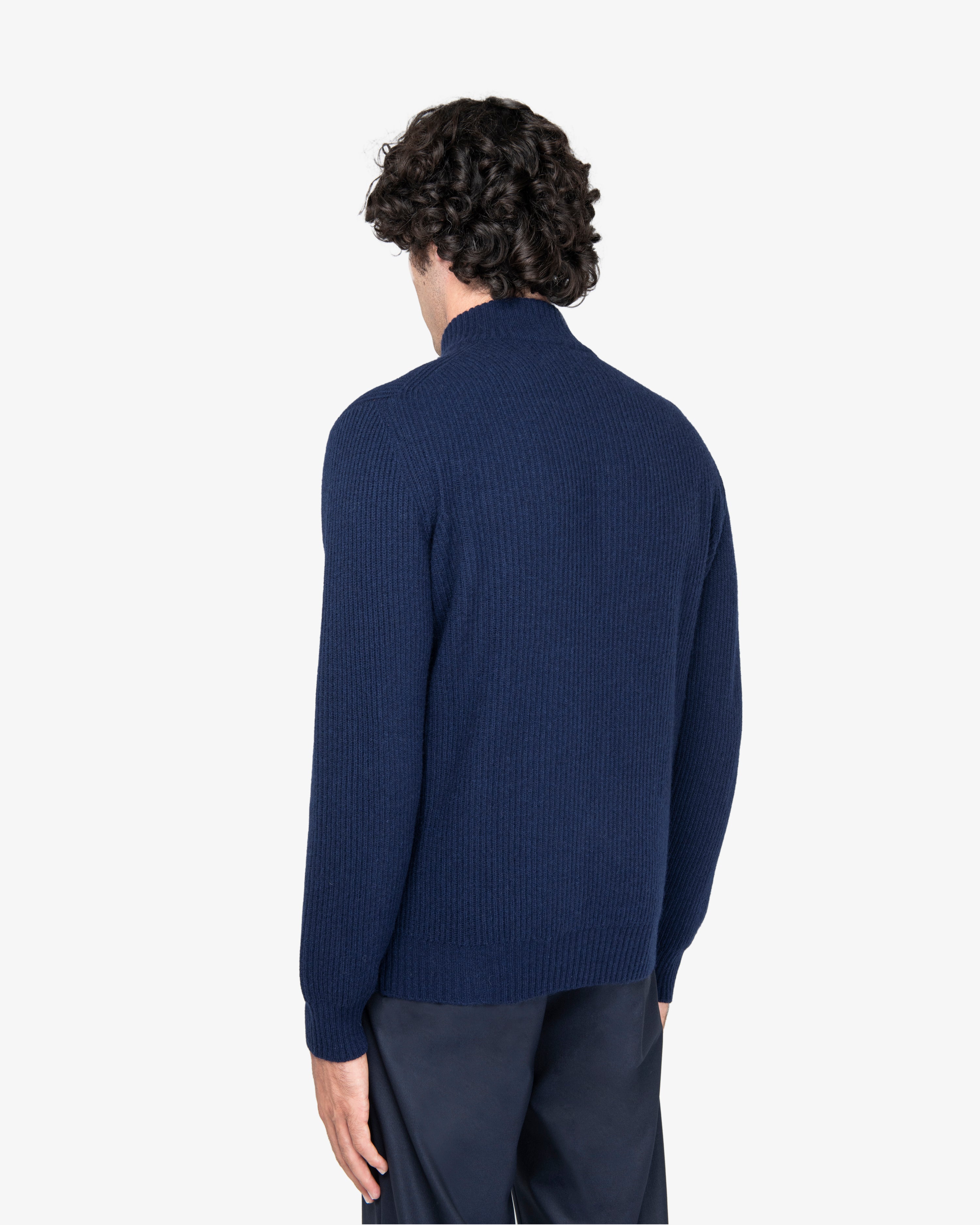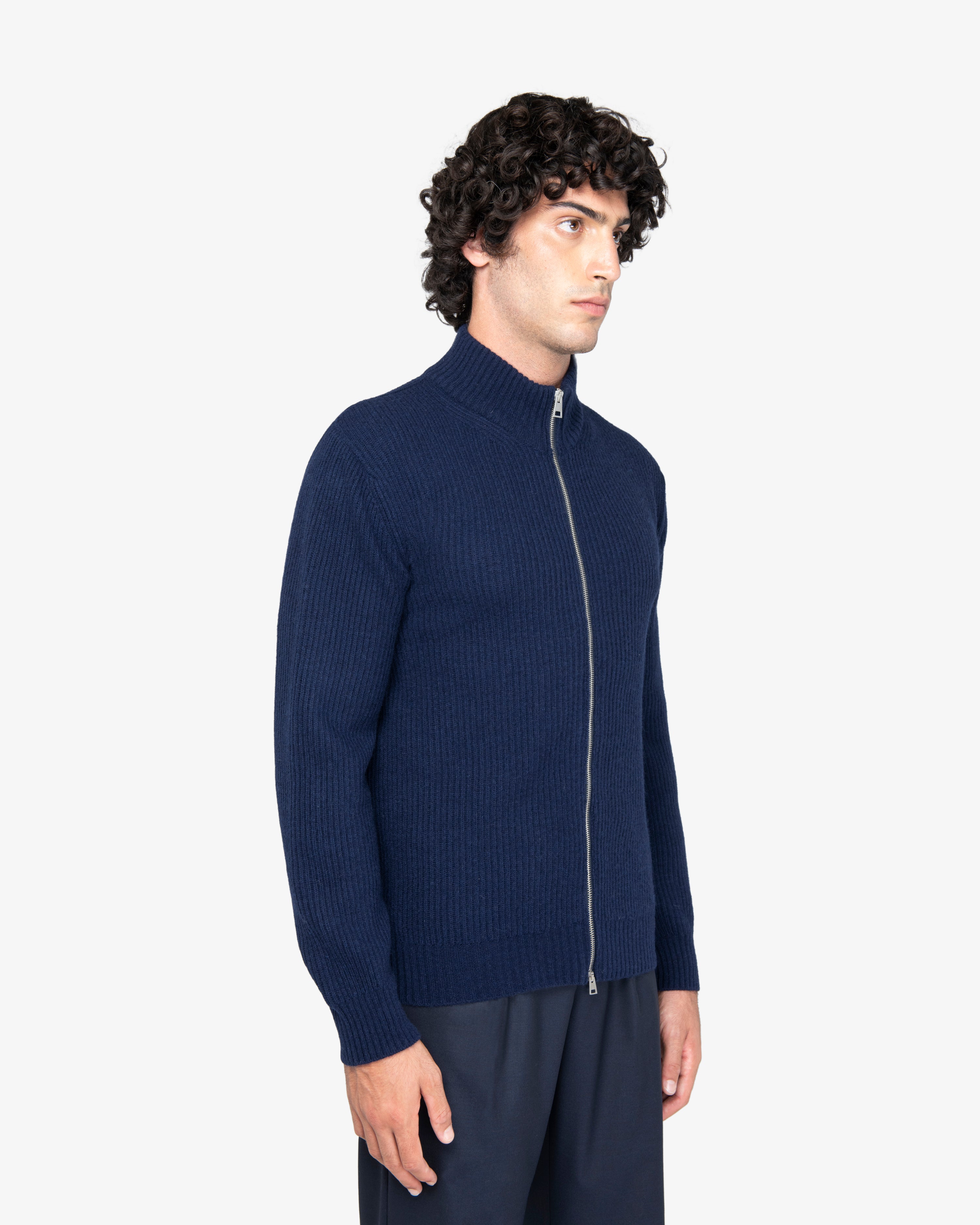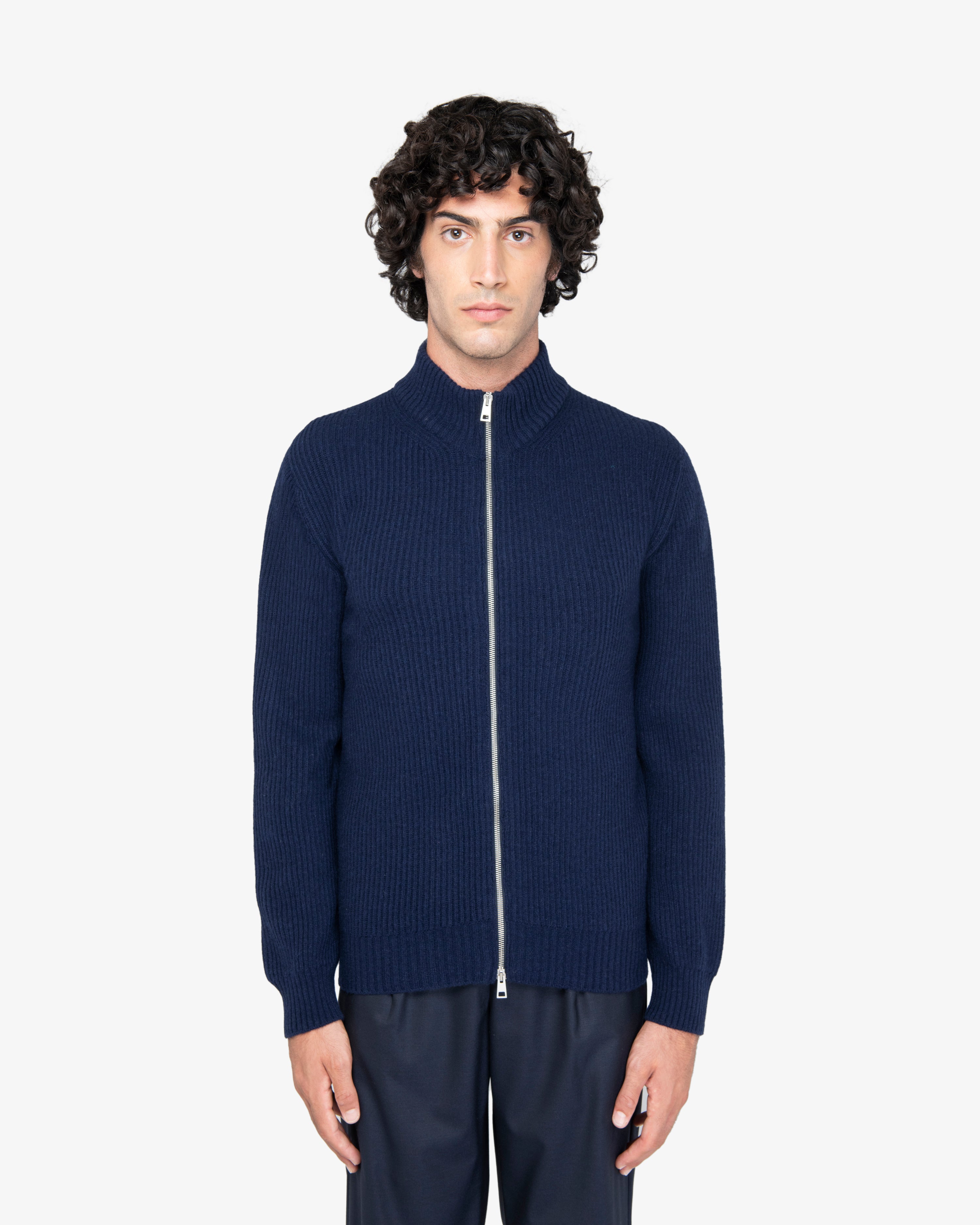 Maglione full-zip con lavorazione a costa inglese, zip a doppio cursore e finiture a costine.